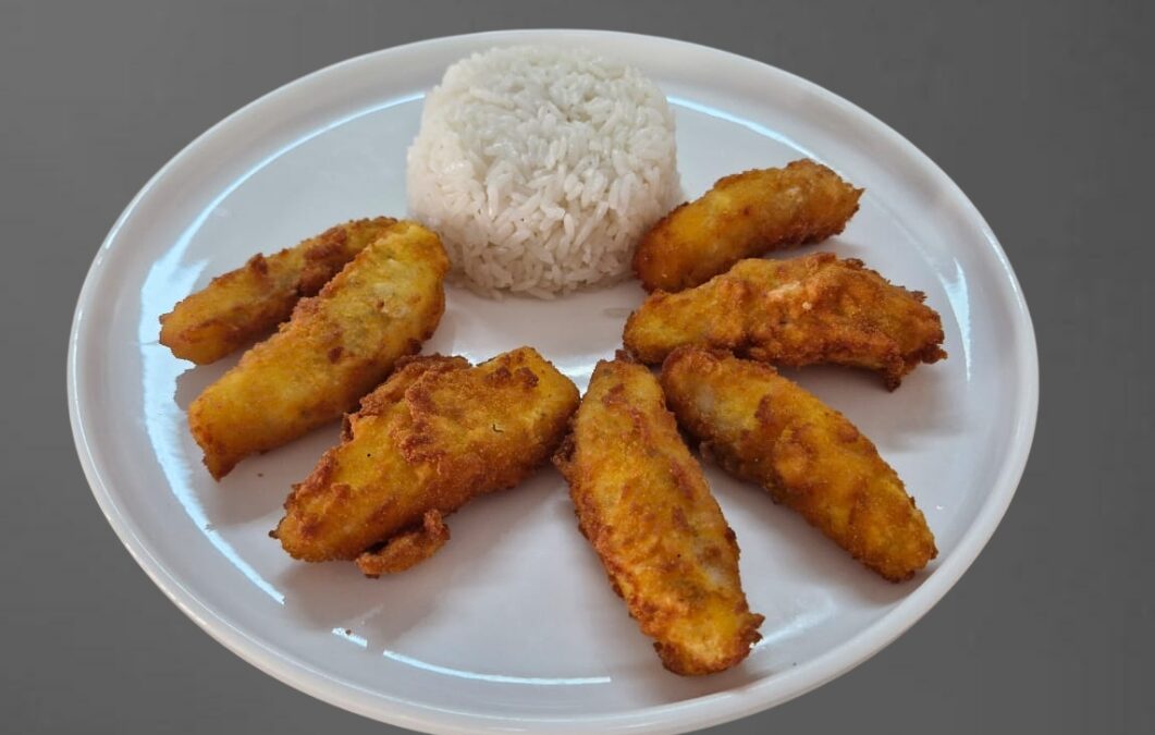 Nuggets de congrio con arroz blanco, papas fritas o ensalada surtida. Nuggets de congrio con arroz blanco, papas fritas o ensalada surtida. $7,900 Incluye vaso de jugo y copa de helado .